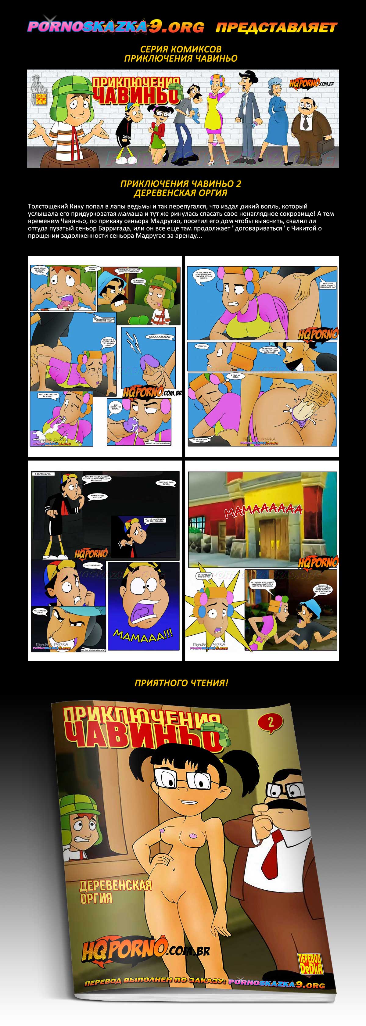 Порно комикс «Приключения Чавиньо. Часть 2. Деревенская оргия.» Толстощекий Кику попал в лапы ведьмы и так перепугался, что издал дикий вопль, который услышала его придурковатая мамаша и тут же ринулась спасать свое ненаглядное сокровище! А тем временем Чавиньо, по приказу сеньора Мадругао, посетил его дом чтобы выяснить, свалил ли оттуда пузатый сеньор Барригада, или он все еще там продолжает «договариваться» с Чикитой о прощении задолженности сеньора Мадругао за аренду…