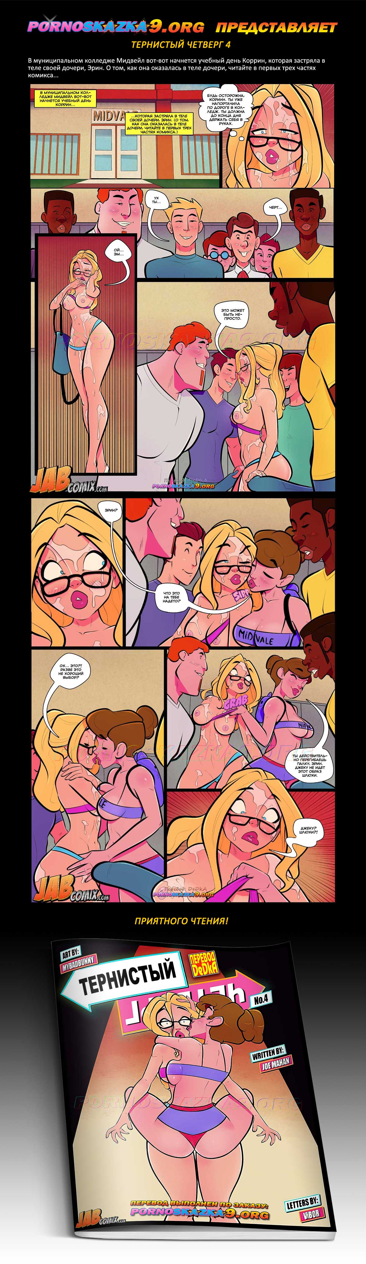 Порно комикс Тернистый четверг. Часть 4. В муниципальном колледже Мидвейл вот-вот начнется учебный день Коррин, которая застряла в теле своей дочери, Эрин. О том, как она оказалась в теле дочери, читайте в первых трех частях комикса…